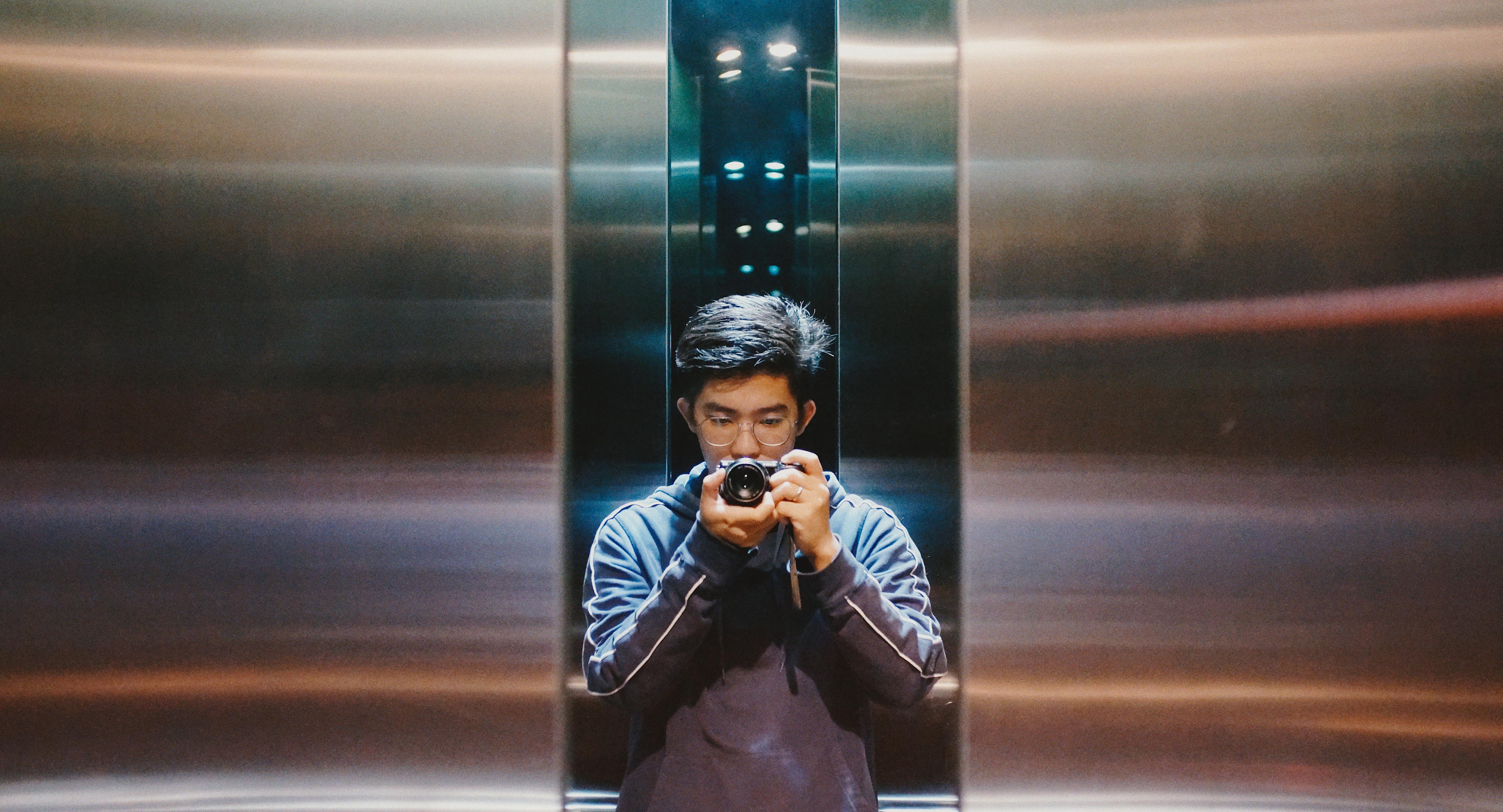 October 15th, 2025—Elevator selfie. Loving the reflections, lighting, and the dull reflective surface.